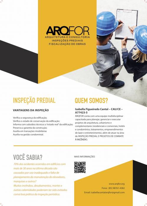 Fiz a inspeção predial do prédio que sou síndica com a Arqfor e fiquei bastante satisfeita. Excelentes profissionais a arquiteta Isabella Cantal e o engenheiro Félix Tadashi. Super indico.