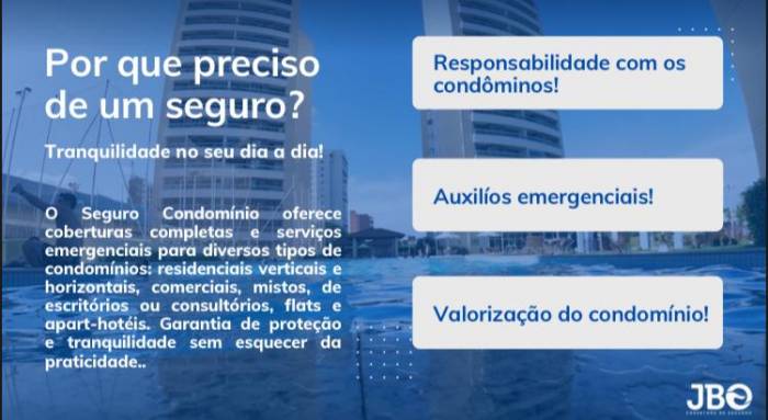 A JBO Corretora de Seguros é especializada em seguros patrimoniais e condominios. O nosso proposito e cuidar para que seu patrimonio esteja seguro e garantir o risco financeiro.